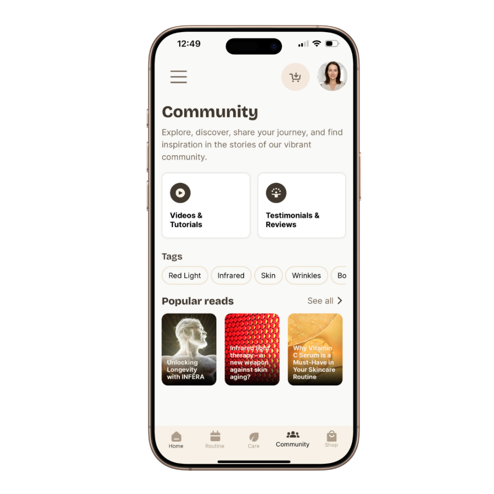 Be inspired by real INFERA users. Browse success stories, share your own progress, and join a community of wellness-driven women who love their light and skincare routine.