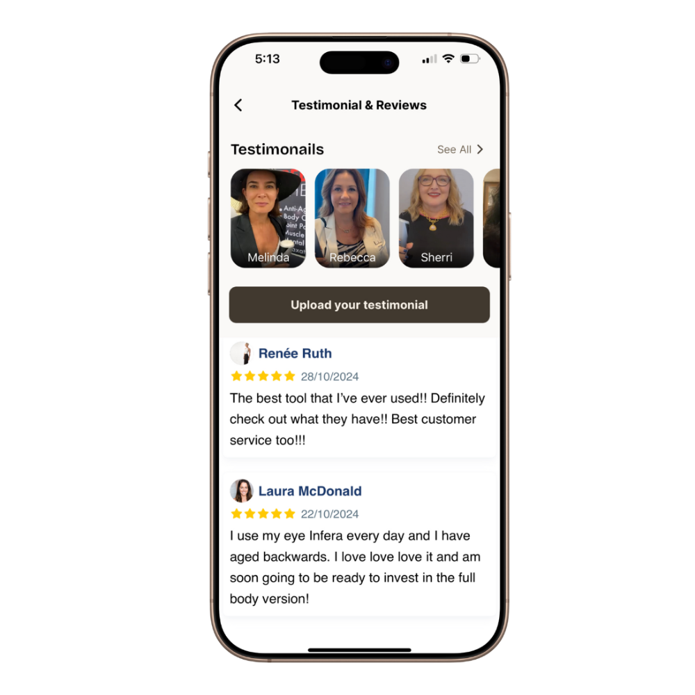 See the ResultsReal people. Real rituals. Explore glowing testimonials and video reviews from the INFERA community—proof that light-powered wellness truly works.