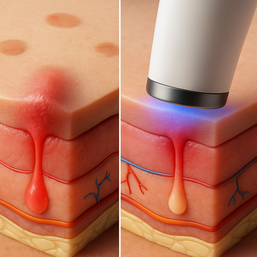 Blue light therapy operates at wavelengths between 400–500nm, which penetrate the upper layers of the skin. This activates natural photochemical reactions that help reduce inflammation, regulate oil production, and kill acne-causing bacteria—all without damaging skin or disrupting the barrier.