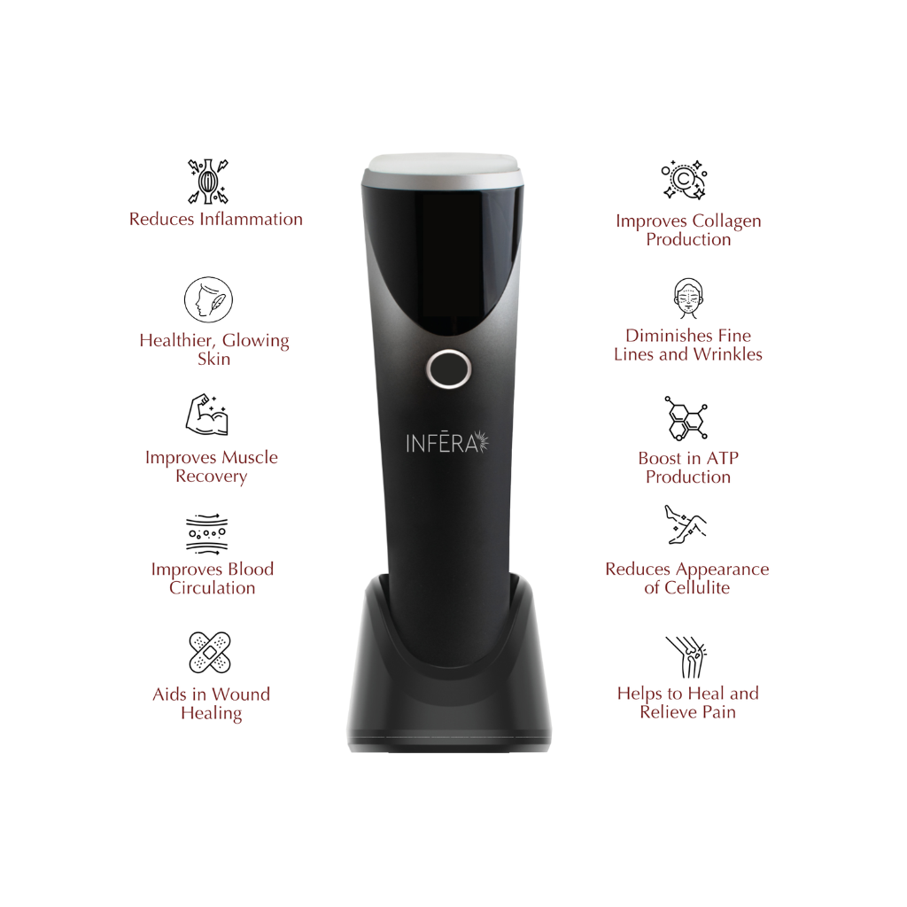 The INFERA device uses advanced red and infrared light therapy combined with topical heat to support skin rejuvenation, circulation, and pain relief. It delivers energy deep into the skin, stimulating collagen production and cellular repair to promote smoother, firmer, and healthier-looking skin.