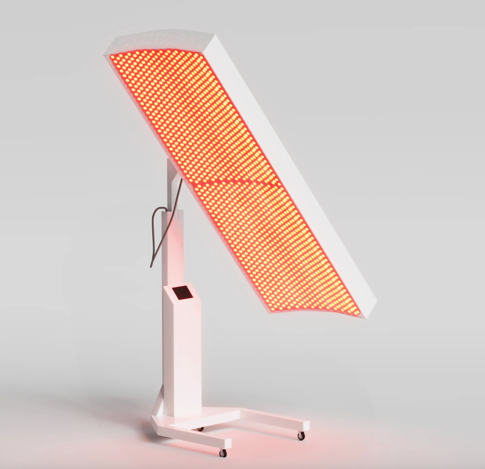 Customizable red, blue, and near-infrared light therapy with touchscreen control and adjustable height.